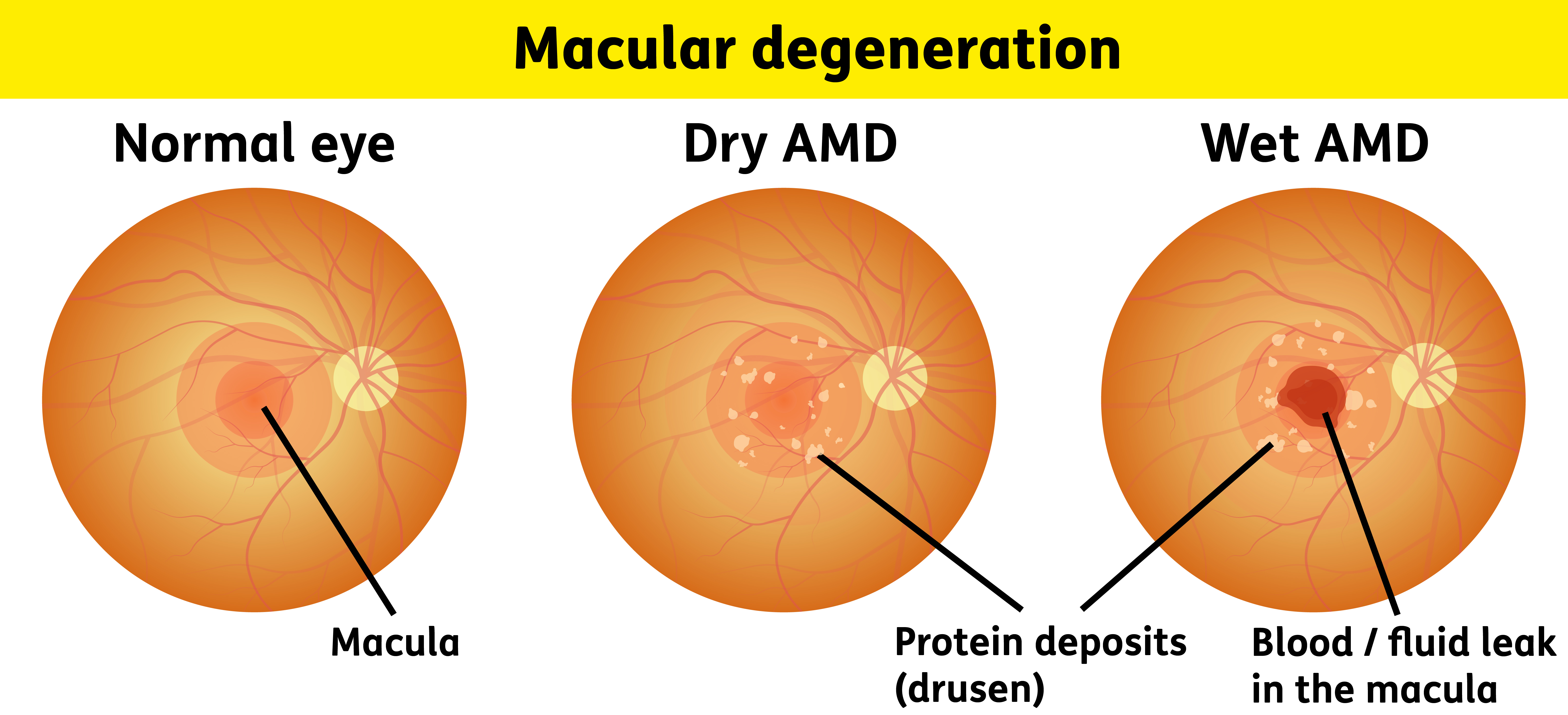 Wet AMD develops when abnormal blood vessels grow into the macula. These leak blood or fluid which leads to scarring of the macula and rapid loss of central vision.