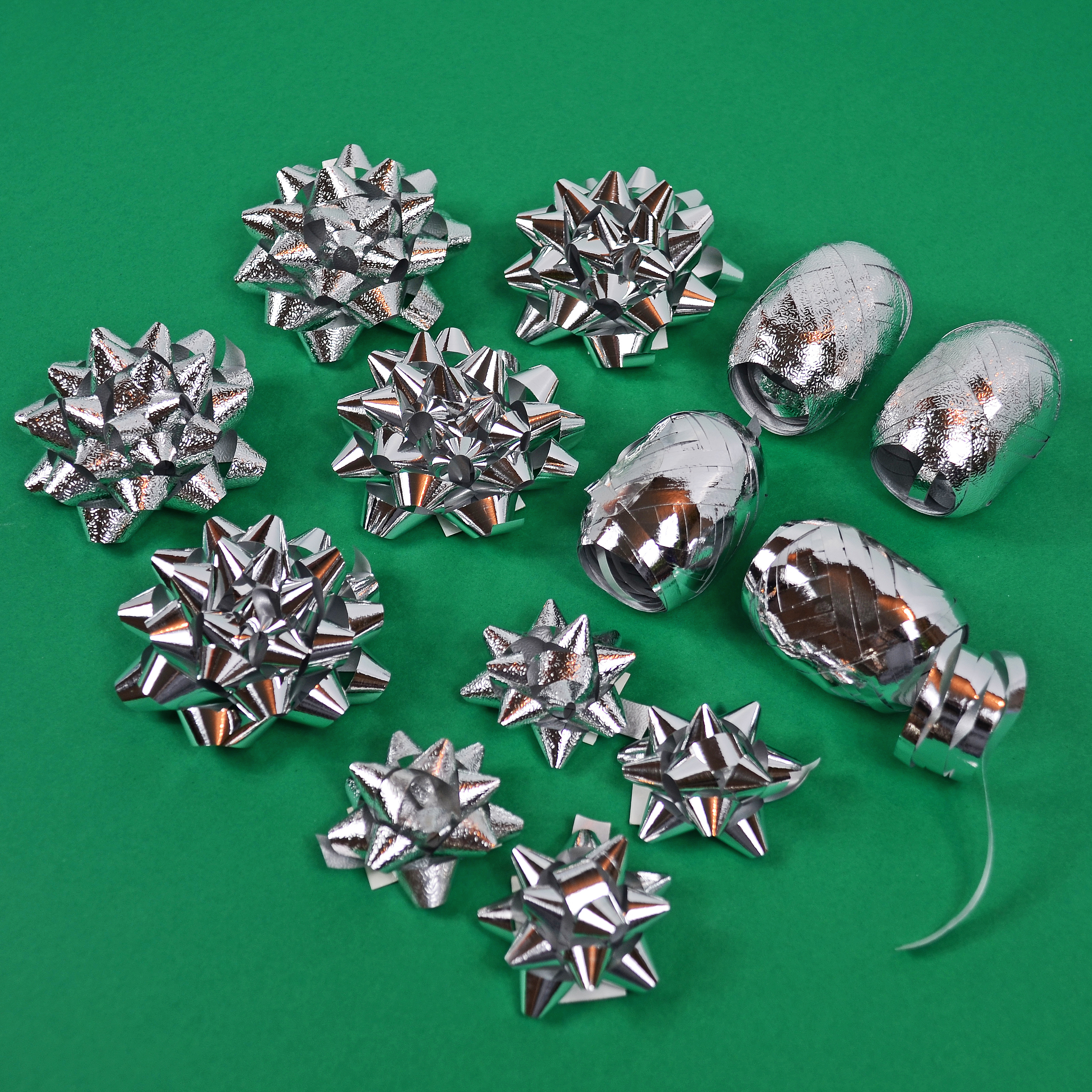 This bumper set contains five large silver bows, four silver mini-bows and four reels of silver curling ribbon.