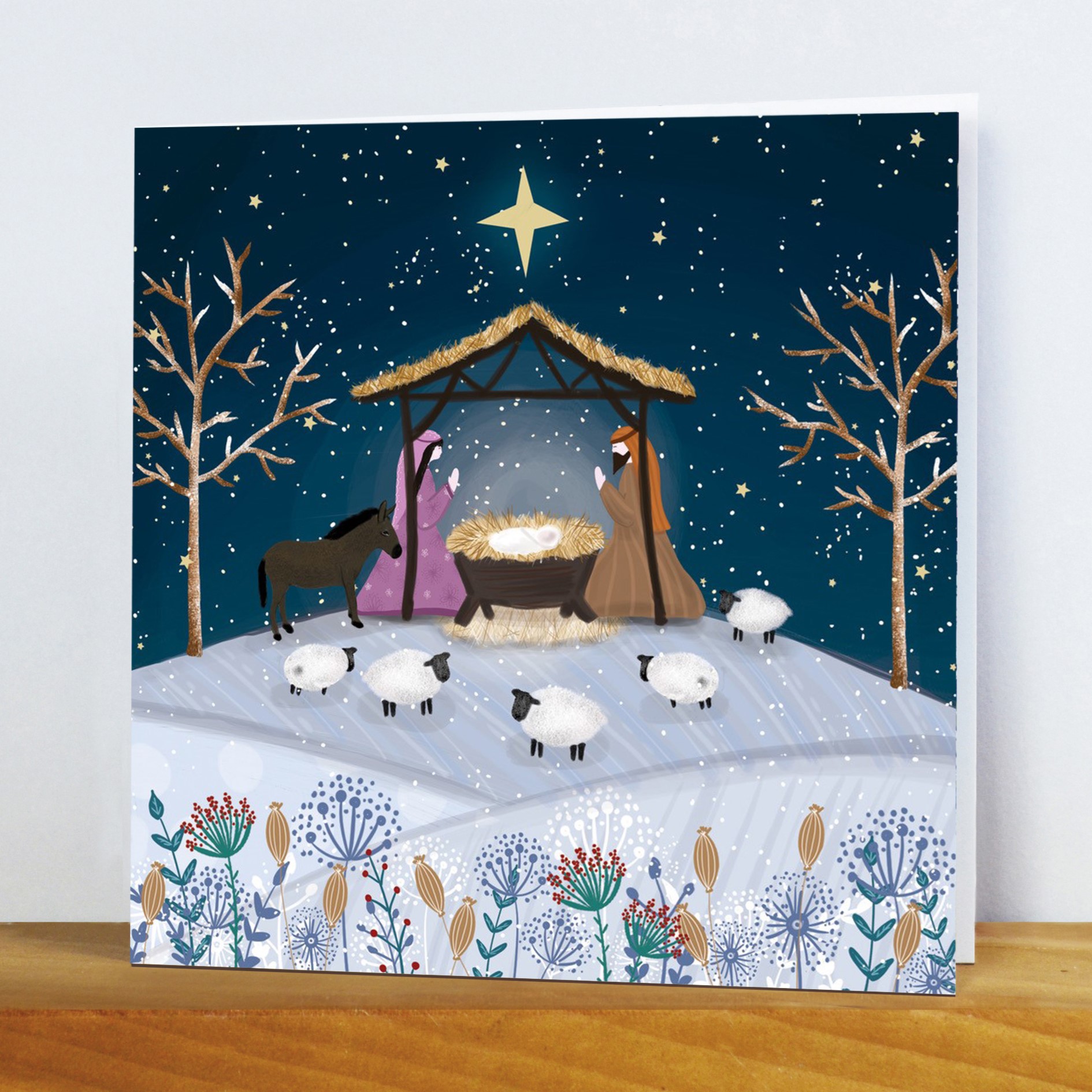 A charming, touching scene in a starlit manger as the animals visit Mary, Joseph and the baby Jesus. A beautiful, traditional card that is sure to bring joy this Christmas time.