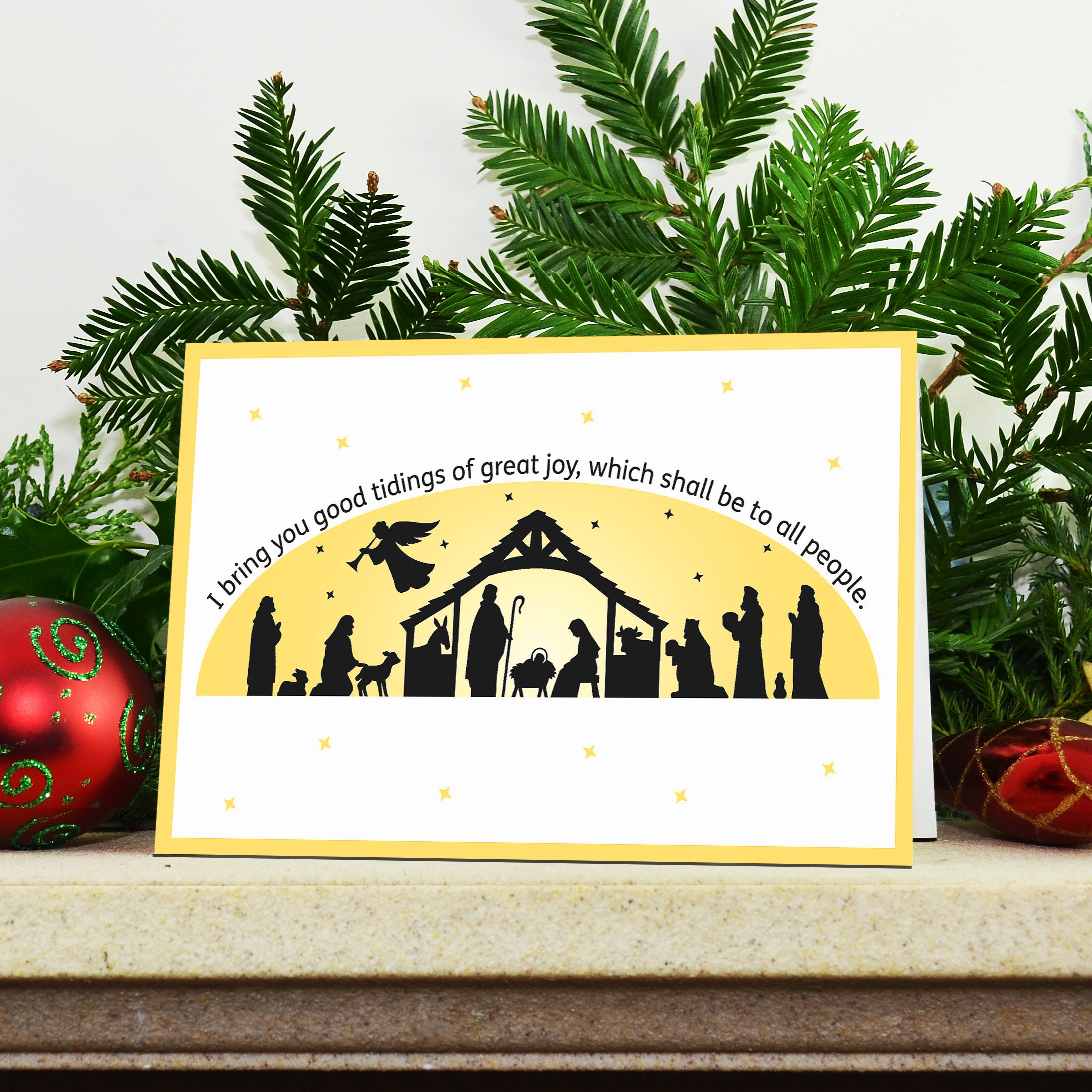 A silhouetted scene of baby Jesus, Mary and Joseph and their visitors in the manger with the wording on the front: I bring you good tidings of great joy, which shall be to all people.