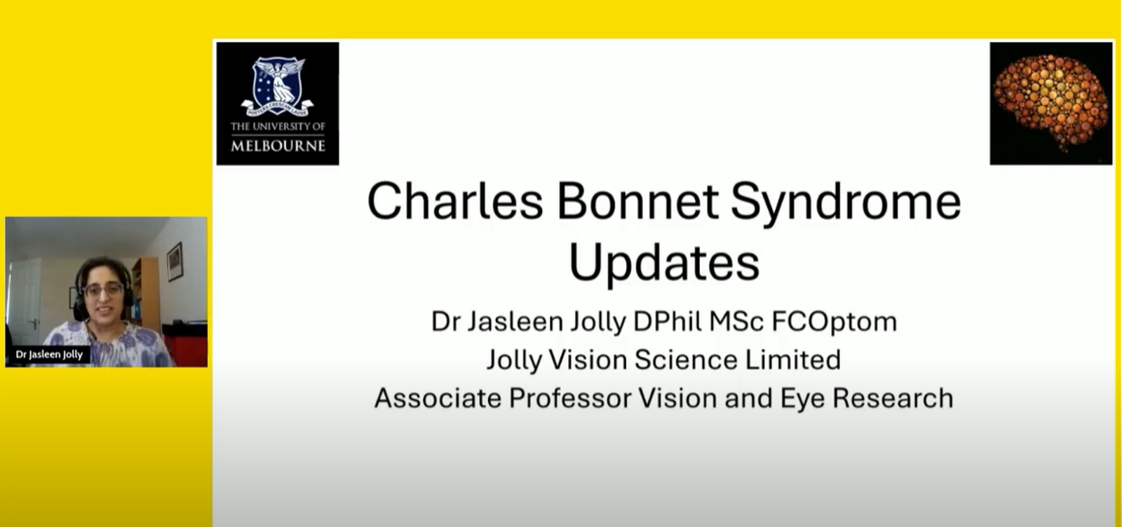 Description: Dr Jasleen Jolly shares updates on the latest Charles Bonnet syndrome research and development.